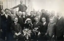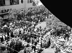 On April 11, 1909, sixty-six families gathered on the sandy shoreline using sea shells in a lottery to divide up lots of what was renamed Tel Aviv in 1910.[2] Dizengoff participated in the lottery, which was captured on film by Abraham Suskind. In the iconic image, members of the collective can be seen standing on sand dunes in the exact location where Rothschild Boulevard currently runs. According to legend, the man standing behind the group, on the slope of the sand dune, is a man who opposed the idea, allegedly telling the others that they are mad because there is no water at the location.