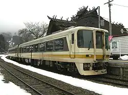 All five cars were later sold to the Aizu Railway that same year, and began operations on the Aizu Railway on 23 March 2002.[4] As the KiHa 8500 series were designed for high-speed operation, problems with the KiHa 8500 series started to surface when in service on the Aizu Railway, which resulted in deterioration of parts due to the frequent station stops the cars had to make.[5] As such, the cars were retired on 30 May 2010 and replaced by newer AT-700 series railcars the same day.[6] The cars were actually supposed to make a special final run on 26 and 27 March 2011 as part of an event, but said event was cancelled due to the Tōhoku earthquake and tsunami.[7]