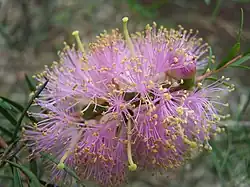 The flowers are white or more usually a shade of pink to mauve. They are arranged in pairs of up to 5, the flowers on opposite sides of the branches forming a spike up to 40 mm (2 in) long and 30 mm (1 in) in diameter. The petals are 4.5–6.5 mm (0.2–0.3 in) long and fall off as the flower matures. There are five bundles of stamens around the flower, each with 30 to 90 stamens giving the spike a fluffy appearance. Flowering mostly occurs from July to September, and is followed by fruit which are woody, almost spherical capsules, 4–6 mm (0.16–0.24 in) in diameter in clusters along the stem.[2][3]