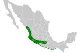 The nominate subspecies of golden-cheeked woodpecker is found in western Mexico between Sinaloa and Nayarit. M. c. flavinuchus is found from Jalisco in west central Mexico south along the coast to Oaxaca and east to Puebla. The species inhabits the interior and edges of mesophytic to xeric forest and more open landscapes like patches of forest, savanna with trees, and plantations. In elevation it ranges from sea level to about 1,500 m (4,900 ft).[4]
