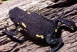 Darwin's toad is jet black with yellow patches on its back, sides, forelimbs, and ventral. It has a red spot on the ventral side of the thigh and part of the abdomen. The palms of his hands and soles of its feet are also red.