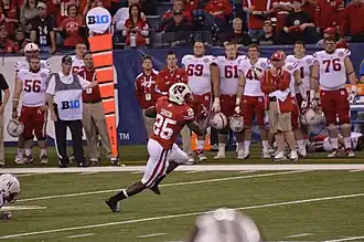 On November 15, Gordon broke LaDainian Tomlinson’s 15 year-old FBS single game rushing record, by two yards with 408 yards versus the #16 Nebraska Cornhuskers. Gordon accomplished this, as well as scoring four rushing touchdowns, on only 25 carries in three quarters of play. The record would be broken the following week by Samaje Perine.[44] In addition, he broke the 339-yard school record, held by Ron Dayne since 1996, and the 377-yard Big Ten Conference record, held by Indiana running back Anthony Thompson since 1989.[45] Gordon garnered multiple Player of the Week awards for his performance against the Huskers. The Walter Camp Football Foundation, Athlon Sports, and CBSSports.com named him National Offensive Player of the Week, and the Big Ten named him the conference Offensive Player of the Week.[46][47][48]