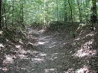 The Memphis to Little Rock Road-Village Creek Segment is a preserved segment of the historic Memphis to Little Rock Road military road in Cross County, Arkansas. Located entirely within Village Creek State Park, this 1.5-mile (2.4 km) segment of roadway is one of the best-preserved portions of the military road built in 1828. The roadway portion, in parts set in dramatically deep cuts in the hills, extends from Village Creek in the east to the western boundary of the park, and is accessible today as a hiking trail.[9]