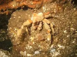 A crab wearing a sponge suit seen underwater below the Menai Suspension Bridge