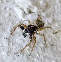 Genetic analysis has shown that the genus is related to the genera Helvetia and Phintella.[7] The species was placed in the tribe Heliophaninae, which was reconstituted as Chrysillini by Wayne Maddison in 2015.[8] The tribe is ubiquitous across most of the continents of the world.[7] it is allocated to the subclade Saltafresia in the clade Salticoida.[9] In 2016, Prószyński created a group of genera named Menemerines after the genus.[10] The vast majority of the species in Menemerines are members of the genus, with additional examples from Kima and Leptorchestes.[11] The species name derives from the Latin word formosus that means neat or shapely.[12]