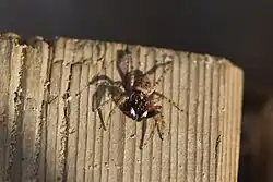 Genetic analysis has shown that Menemerus is related to the genera Helvetia and Phintella.[6] The genus was placed in the tribe Heliophaninae, but this tribe was reconstituted as Chrysillini by Wayne Maddison in 2015.[7] The tribe is ubiquitous across most continents of the world.[6] Maddison allocated it to the subclade Saltafresia in the clade Salticoida.[8] In 2016, Prószyński created a group of genera named Menemerines after the genus.[9] The vast majority of the species in Menemerines are members of the genus, with additional examples from Kima and Leptorchestes..[10] The species name derives from the Latin for southern, meridionalis.[11]