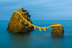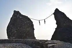 The most famous pair is the pair at Futami Okitama Shrine in Futami-ura, two rocky stacks off the coast from Ise, Mie, Japan. They are joined by a shimenawa (a heavy rope of rice straw) and are considered sacred by worshippers of the shrine. The shimenawa, composed of five separate strands which each have a mass of 40 kilograms,[1] must be replaced several times a year in a special ceremony. The larger rock, said to be male, has a small torii at its peak.