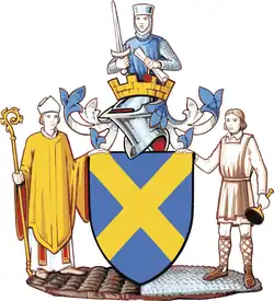 The saltire as a symbol of Mercia may have been in use since the time of King Offa.[47] By the 13th century, the saltire had become the attributed arms of the Kingdom of Mercia.[48] The arms are blazoned Azure, a saltire Or, meaning a gold (or yellow) saltire on a blue field. The arms were subsequently used by the Abbey of St Albans, founded by King Offa of Mercia. With the dissolution of the Abbey and the incorporation of the borough of St Albans the device was used on the town's corporate seal and was officially recorded as the arms of the town at an heraldic visitation in 1634.[49]