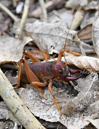 M. isolata is the largest tusked wētā, 90 mm long. Captive males can weigh 28 g and females 37 g, though wild specimens are generally smaller: 23 and 25 g.[5] Adult males have long brown tusks curving from their mandibles, projecting far in front of their head; these vary significantly in size between males.[3] They use these to spar with other males in territorial pushing contests, each trying to overturn the other.[6] If disturbed, they will raise their forelegs, hiss, and gnash their jaws; they stridulate by rubbing their femurs against their abdomen, and males can make a rasping noise by rubbing their tusks together.[7] Both sexes will also defecate foul-smelling liquid faeces. Despite these displays, they rarely bite when handled.[5]