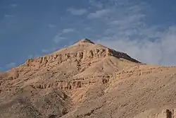 Meretseger was especially associated with the hill now called el Qurn "The Horn" (Ancient Egyptian: tꜣ-dhnt "The Peak"[4]), a natural peak, the highest point (420 m) in the Theban Hills, which dramatically overlooks the Valley of the Kings.[3][4] It has an almost pyramidal shape when viewed from the entrance to the Valley of the Kings, and therefore some Egyptologists believe it may have been the reason for choosing the location as a royal necropolis. El Qurn, also believed to be one of the entrances to the Duat (underworld),[14] was sacred to both Meretseger and Hathor, but the former was considered its real personification.[5] For this reason, two of Meretseger's many epithets were "Peak of the West" (Dehent-Imentet)[10][9] and "Lady Of The Peak".[15] Many small stelae created by artisans and workers have been found as evidence of devotion to their favorite deities: in addition to Meretseger, Ptah,[16] Amun,[17] Hathor,[18] Thoth[19] and the deified pharaoh Amenhotep I (c. 1525–1504 BC), whose cult was very popular in Deir el-Medina.[20]