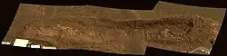 Figure 6. Burns Cliff in Endurance Crater. This image is one of the best known by Opportunity's Pancam. The original file is a huge (12,316 x 4,218 pixels) "mosaic" of many images. It has a "fish eye" view distortion. Click on the image for higher resolution. Burns Cliff is at least 7 m tall.[37] Meridiani sediment cliffs as big as Burns Cliff are not common. They only occur in large Meridiani craters younger than the sediments. The sediments in Burns Cliff are more weathered than those in Figure 5 since Endurance Crater is much older than Concepcion Crater.[24] Opportunity collected data at Burns Cliff over several months in 2004, and many important papers used this data.[37][38][39][40][41][42] Images taken on Sols 287-294 (2004-11-13 to 2004-11-20).