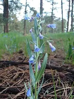 Mertensia lanceolata, known as prairie bluebells, lance-leaved bluebells, lance-leaved lungwort, and narrow-leaved languid ladies is a species of flowering plant native to the Rocky Mountains and areas of the northern Great Plains in western North America.[1] A herbaceous perennial it has blue-green leaves alternately arranged on its smooth flowering stalk. Its flower buds are pink-purple and become blue as they open.