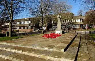 The area in front of the building was occupied by a public house known as The Lamb.[7] It was demolished in the mid-1980s and replaced by a small green with a war memorial which was unveiled in 1990.[8][9][10]