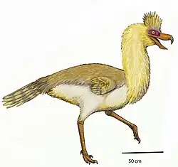 It wasn't until 1914 that additional fossils of Mesembriornis were described by Gaetano Rovereto, who believed that the genus name Mesembriornis was a nomen nudum and should be replaced by the genus name Hermosiornis, even creating the family Hermosiornidae for the genus and the two species he assigned to it, Mesembriornis milneedwardsi and Mesembriornis (Paleociconia) australis.[6] Rovereto referred a nearly complete skeleton lacking the skull to M. milneedwardsi (MACN-5944) that may actually be from the same individual as the holotype (MLP-140-142).[7][1] Rovereto also believed that "Hermosiornis" was the ancestor of the modern Cariama and the descendant of Psilopterus (Pelecyornis),[6] though this has since been disproven.[1] The only other valid species of Mesembriornis was described in the same paper as Prophororhacos incertus based on a dorsal vertebra, partial right hindlimb, and assorted postcranial elements found in the Upper Miocene to Lower Pliocene strata of the Andalgala Formation in Catamarca Province, Argentina.[1] Several more fragmentary postcranial elements of an individual originally ascribed to Procariama also belong to Mesembriornis incertus.[6][1] Skull material of Mesembriornis wasn't described until in 1946, Uruguayan paleontologist Lucas Kraglievich named another species of "Hermosiornis", Hermosiornis rapax, based on a nearly complete skeleton (MMP-S155) including a mandible and partial skull but missing parts of the limbs.[1] The fossils described by Rovereto and Kraglievich were found in the Chapadmalal Formation, dating to the Chapadmalalan of the late Pliocene.[8][1] Mesembriornis lived on the pampa of eastern Argentina, from the Late Miocene to the Late Pliocene, roughly 5.3 to 4 million years ago. Together with the North American giant Titanis walleri, it was among the last terror birds alive.[1]