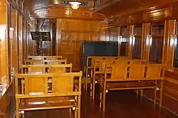 Messenger of Peace is a dark green, wooden railroad car made of yellow pine. The car is 70 feet (21 m) long, 10 feet (3.0 m) wide, and 13 feet (4.0 m) high when sitting on trucks. The roof is rounded with an elevated ridge in which are set clerestory casement windows for both light and ventilation. With doors located at each end of the car, the front of the car contains a small compartment that served as living quarters for the minister; the remainder of the car provided a large open area for church services. The interior has decorative vertically fluted wainscoting made of white oak. Originally, the car used kerosene lighting, which was later replaced with acetylene lighting which in turn was replaced with electric lighting.[2]