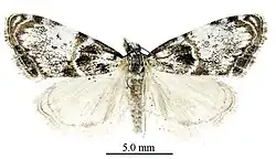 The length of the forewings is 9–10 mm. The forewings are densely covered with blackish-brown scales from the basal one fifth to the medial fascia. The other area is sparsely suffused with pale brown scales. The costa has a longitudinal blackish brown stripe extending from the base to near the medial fascia, which is conspicuously convex, incurved slightly near the middle and runs to before the middle of the dorsum. It is golden, edged with pale brown. The discoidal cell has two brown spots and the apex is golden mixed with pale brown, with one white stripe. The subterminal line is golden mixed with pale brown and there are six terminal black dots running from the middle of the termen to the tornus. The hindwings are white, suffused with grey scales. The subterminal fascia is pale brown. Adults have been recorded on wing in late July.[1]
