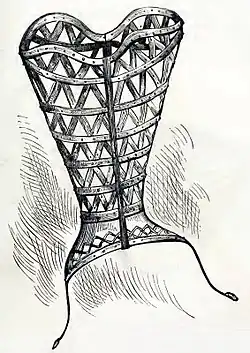 Although surviving metal bodices are usually dated to the late 16th and early 17th century, Steele has stated that some of the more extreme and elaborate examples are fakes created from the 19th century onwards to cater to fetishistic "fantasies about women imprisoned in metal corsets".[2] For example, Herbert Norris claimed in Tudor Costume and Fashion (1938) that a misbehaving wife would be locked into a metal corset by her husband until she promised to behave.[1] One such iron corset, with a 14 in (360 mm) waist, was acquired by the Fashion Institute of Technology Museum and described as dating from 1580–1600, but is now considered to be a forgery from the turn of the 19th and 20th centuries.[3] Steele noted suspicious similarities between this corset and an illustration first published in 1868 in The Corset and the Crinoline, a "fetishistic" book claiming to offer a historical overview of fashion, and draws parallels between such corsets and fake medieval chastity belts.[2] Harold Koda, the former curator of the Metropolitan Museum of Art's Costume Institute, states that the excessive, mechanically produced regularity of the garment's structure is evidence for its being a 19th-century fabrication.[6] Koda's take on the significant percentage of extant 19th-century metal corsets made in emulation of purported 16th-century models is that they were created to cater to a specialist market, perhaps for inclusion in collector's cabinets.[6]