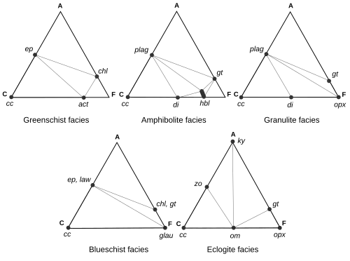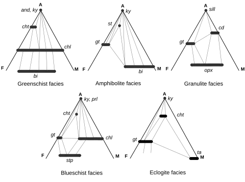 The amphibolite facies is a facies of medium pressure and average to high temperature. It is named after amphiboles that form under such circumstances. It has the following mineral assemblages: