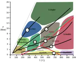 Metamorphic series include the Barrovian and Buchan series of metamorphic rocks. George Barrow was a geologist in Scotland who discovered the Barrovian series.[1] These are also called metamorphic facies series. A metamorphic facies series is a sequence of metamorphic facies which plot in a temperature-pressure diagram along a line, and this line represents a certain geothermal gradient. They are not the same as metamorphic zones, as these are defined as a region on a geological map where the pressure-temperature conditions for an index mineral (a mineral that indicates the approximate metamorphic grade of a rock), were appropriate for these minerals to form.[2][3]