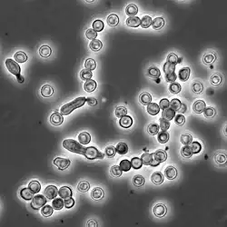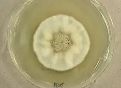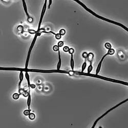 Colonies of M. granulomatis differ in morphology depending on the growth medium used. Colonies on Potato dextrose agar (PDA) after 3 days incubation at 30 °C (86 °F) are white in colour and reach 3 mm in diameter.[4] Cultures developed on Sabouraud dextrose agar (SDA) are similar in appearance although they grow more slowly on this medium.[4] After 10 days, colonies on PDA reached a diameter of 27 mm and produced a diffusible brownish-grey pigment. Colonies the SDA are 12 mm in diameter and grey-ochre in colour.[4] The hyphae of M. granulomatis are septate and bear phialides that have single apical openings (monophialides) resembling a wine bottle.[1][5] The conidia produced are in short, curved, chains, appearing glassy and smooth.[1] Conidia are spherical-to-oval and 3.3-3.8 μm in length by 1.2-1.6 μm in width.[3] The fungus produces a yeast-like stage in vitro on PDA after 3 days incubation at 35°C.[1]
