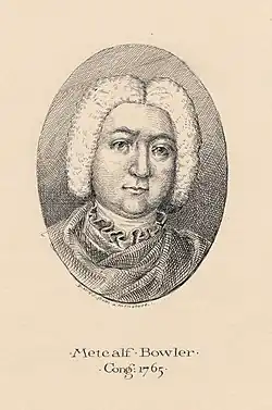 Metcalf Bowler (1726—September 24, 1789) was a Rhode Island merchant, politician, and magistrate. He was for many years speaker of the house in the Rhode Island colonial assembly, attended the 1754 Albany Congress, and was elected a delegate to the 1765 Stamp Act Congress. In 1776 he was appointed to the newly independent state's supreme court. A successful Atlantic merchant, he was financially ruined by the American Revolutionary War, and was in the 20th century revealed to be a paid informant for the British.
