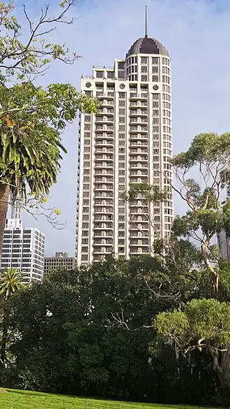 Metropolis is a 40-storey residential / hotel skyscraper in the Auckland CBD of Auckland, New Zealand, developed in 1999 by Krukziener Properties. Commended for its style and quality, the NZ$180 million cost of its construction also led to major financial fallout.[2] Metropolis is considered one of Auckland's most exclusive apartment buildings,[3] and it was the tallest residential building in New Zealand until 2020 when the nearby Pacifica was completed.