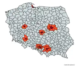 - ^ a b Katowice metropolitan area, Rybnik metropolitan area, and Bielsko-Biała metropolitan area can also be considered parts of one polycentric Katowice-Ostrava metropolitan area.