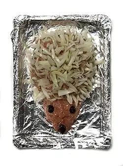 At buffets, mett is occasionally served as a Mettigel (Mett hedgehog, also Hackepeterigel or Hackepeterschwein). This form of serving mett has been popular since the 1950s.[3][4] To serve it, a large amount of mett is shaped as a hedgehog, and quartered onion rings or pretzel sticks are used as spikes, with olives as eyes and nose.