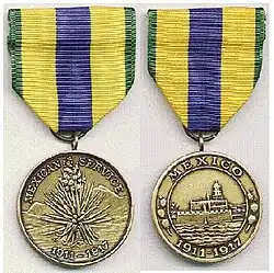 The Mexican Service Medal awarded by the Army was established by General Orders of the United States War Department on December 12, 1917. The Navy's Mexican Service Medal was established by Navy Department General Orders Number 365 on February 11, 1918, as amended by Navy Department General Orders No. 464 of April 27, 1919. The Mexican Service Medal recognizes those servicemen who performed military service against Mexican forces between April 12, 1911 and June 16, 1919.[1]