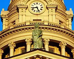 The Miami County Courthouse is an historic building in Troy, Ohio, United States. Built from 1885 to 1888,[3] it was designed by noted Ohio (and later New York) architect Joseph W. Yost, who also designed the similar Belmont County Courthouse built at the same time in St. Clairsville. It has high arched windows and Corinthian columns supporting the outthrust corners and main entrance. A flight of stairs runs to the main entrance. The central pediment rests on an arch supported by Corinthian columns. The corners of the building thrust out and support a pediment, on top of each rests a tower crowned with an urn-shaped finial. A central tower rises from the middle of the building supporting the clock tower and dome, and a statue of justice stands at the very top.[1]