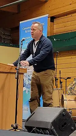 Michael Byers presenting a talk at the 2024 Kitikmeot Trade Show in Cambridge Bay, Nunavut