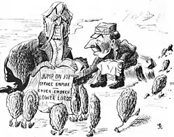 - Clara in Blunderland (1902),[31] with Harold Begbie and Stafford Ransome. Political satire, published under the collective pseudonym Caroline Lewis.[32] There was a sequel, Lost in Blunderland: The Further Adventures of Clara (1903).[33] The satire stemmed in part from the handling of the Second Anglo-Boer War by the Conservative government. Begbie and James Stafford Ransome (1860–1931) were other journalists.[34][35] "Clara" represents Arthur Balfour, picking up on a nickname from his college days at Cambridge.[36][37] A cast of characters from the "Alice" books by Lewis Carroll were modelled on Conservative and Liberal politicians of the day, with Joseph Chamberlain as the Red Queen.[30]