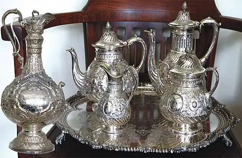 Following his defeat in the Walker Whiskey Trophy events, a number of Rush's admirers and backers held a banquet in his honour, at which they presented him with an illuminated testimonial along with a sterling silver tea set, salver, and claret jug, valued at £200.[63] These recognised his excellence as a sportsman, and his admirable qualities as a man. The salver was inscribed with a dedication, and each piece bore an inscribed caricature of Rush at the oars of an outrigger skiff. The silver items are now in the collection of the Clarence River Historical Society[64] in Grafton, New South Wales.