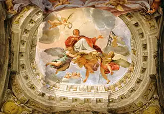 They became the pre-eminent quadratura fresco painters of northern Italy with Colonna principally executing the figurative elements and Mitelli, the quadratura or illusionistic architectural frameworks: in Modena, they painted in the Este palace at Sassuolo;[2] they executed the ceiling of the now destroyed Oratorio de San Girolamo of Rimini; in 1657 they carried out the decoration of the chapel of the Rosary in the basilica of San Domenico in Bologna, including a framed 'Assumption of the Virgin'; and between 1653 and 1658, they painted the gallery leading to the High Altar of San Michele in Bosco.