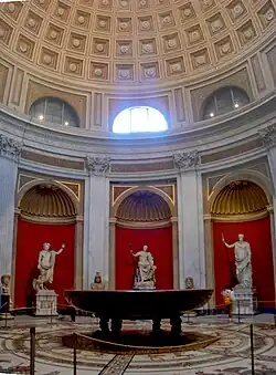 For Pope Pius VI Simonetti designed a sequence of three new halls that links the Cortile Ottagono with the western wing of Bramante's complex. First to be built was the Sala a Croce Greca, which was named after its plan and based on Roman tomb architecture since it was designed to house the two colossal porphyry sarcophagi taken from the Mausoleum of Constantina.[4] Its crossing (w. 9 m) is covered with a shallow sail vault, and its arms with coffered barrel vaults; the articulating pilaster order is a hybrid of Doric, Tuscan, and Ionic. This room is reached from the library wing of the main palace by a grand, double-return staircase flanked by free-standing columns and piers, which support the raking cornice of a coffered barrel vault. This was produced in collaboration with Pietro Camporese the Elder; the monumental vestibule for the staircase was added in 1786 by Pietro's son Giuseppe. The Sala Rotonda (c. 1780) is based on the Temple of Minerva Medica (4th century AD) in Rome.[5] It is a domed cylindrical space (diam. nearly 18 m), ten bays in circumference, surrounded by statuary niches between fluted pilasters and lit by a drum of thermal windows. Leading from this hall to the Cortile Ottagono is the Sala delle Muse (c. 1782; l. 24 m), which consists of a central octagon with a high, coved vault and barrel-vaulted vestibules at either end. The form of this space and its articulation by free-standing Corinthian columns, with vault frescoes and canvases (1786) by Tommaso Conca, was intended to re-create the impression of similar halls in Roman baths and palaces.[6]