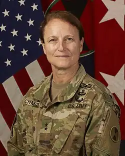 Michelle A. Schmidt is United States Army major general who has served as commanding general of the 7th Infantry Division since September 15, 2023.[1] She most recently served as the deputy commanding general of the I Corps from August to September 2023. She previously served as the director of force development of the United States Army from July 2022 to August 2023.[2] Prior to that assignment, she served as Director of Operations for the Defense Intelligence Agency from July 2021 to June 2022 and Deputy Chief of Staff for Intelligence of the Resolute Support Mission and Director of Intelligence for United States Forces-Afghanistan from July 2020 to July 2021.[3][4][5][6][7][8]