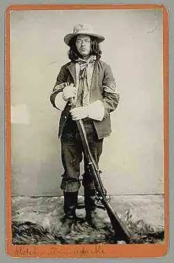 Mickey Free (1848/1851 - 1914), Apache name Mig-gan-la-iae, birth name Felix Telles,[2] was an Apache Indian scout and bounty hunter on the American frontier.[3][4] Following his kidnapping by Apaches as a child (an event which led to the Bascom Affair), he was raised as one and became a warrior. Later he joined the U.S. Army's Apache Scouts, serving at Fort Verde between December 1874 and May 1878 and was given the nickname Mickey Free.[2]