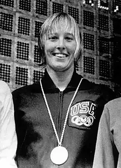 She made an Olympic comeback and won the gold medal in the 1972 Summer Olympics in the three-meter springboard event. King noted that, while she was caught up in the pageantry and adventure of the Olympics in 1968, she was 28 years old at the Munich games; she viewed it as her "last hurrah," and "it was all business."[6] Going into the final round in Munich, King was in third place. She won the gold on her final dive, the same half-somersault with a one-and-a-half twist that cost her gold in Mexico City.[3] When Palestinian gunmen took Israeli athletes hostage, King and her coaches used zoom lenses to observe the gunmen on a balcony outside an apartment of Israeli athletes.[7] "The Olympics are such a wonderful tradition for sport, but it has never been the same since 1972, given the tragedy there," King said. "The beauty of sportsmanship is spoiled by the need for security."[8]