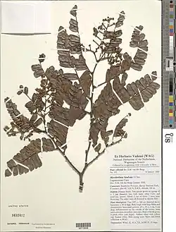 Microberlinia bisulcata is a tall forest tree, growing to a height of up to 40 m (130 ft) with massive buttress roots, and towering above the canopy. The lower half of the cylindrical trunk is devoid of branches. The leaves are small and the flowers are pea-like. The roots have an ectomycorrhizal association with fungi in the soil.[2]