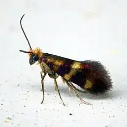 Forewing length: male 3.3–3.6 millimetres (0.13–0.14 in); female 3.5–4.3 millimetres (0.14–0.17 in). Head black brown, vestiture of hair-like scales on the head white to rusty yellow; antennae dark brown, golden shining with a purple tinge, nearly 4/5 (male), respectively, nearly 3/5 (female) of forewing length. Thorax bronzy golden, posteriorly reddish to purple, tegulae coppery to purple violet; ground colour of forewing reddish golden to purple violet, distal half sometimes purplish brown, outer margin sometimes reddish golden again, apex rarely also of this colour; a bronzy golden colouration from the base to 1/4, leaving a purple violet basal spot at costa; markings light golden to golden, delicately bordered in bronzy gold: a broad fascia at 1/2, slightly bent outwards, extending across the whole width of the forewing; sometimes a small costal spot at 3/5 (found in 7 of 17 specimens); a larger, almost round to slightly oval spot at 3/4, extending from costa across more than half of, sometimes even across the whole forewing width (in the latter case the posterior part of this fascia is bronzy golden); fringe golden, basally purple coloured, outwards whitish; hindwing bronzy golden, with an intense purple tinge; fringe bronzy golden, outwards whitish; legs and abdomen brown, golden shining.