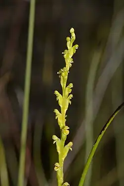 Microtis orbicularis, commonly known as the dark mignonette orchid,[2] is a species of orchid endemic to southern Australia. It has a single thin, more or less hollow, onion-like leaf and up to fifty small yellowish-green and red flowers. The plants grow in winter-wet areas, often in shallow water and unlike the similar M. cupularis do not turn black as they dry.