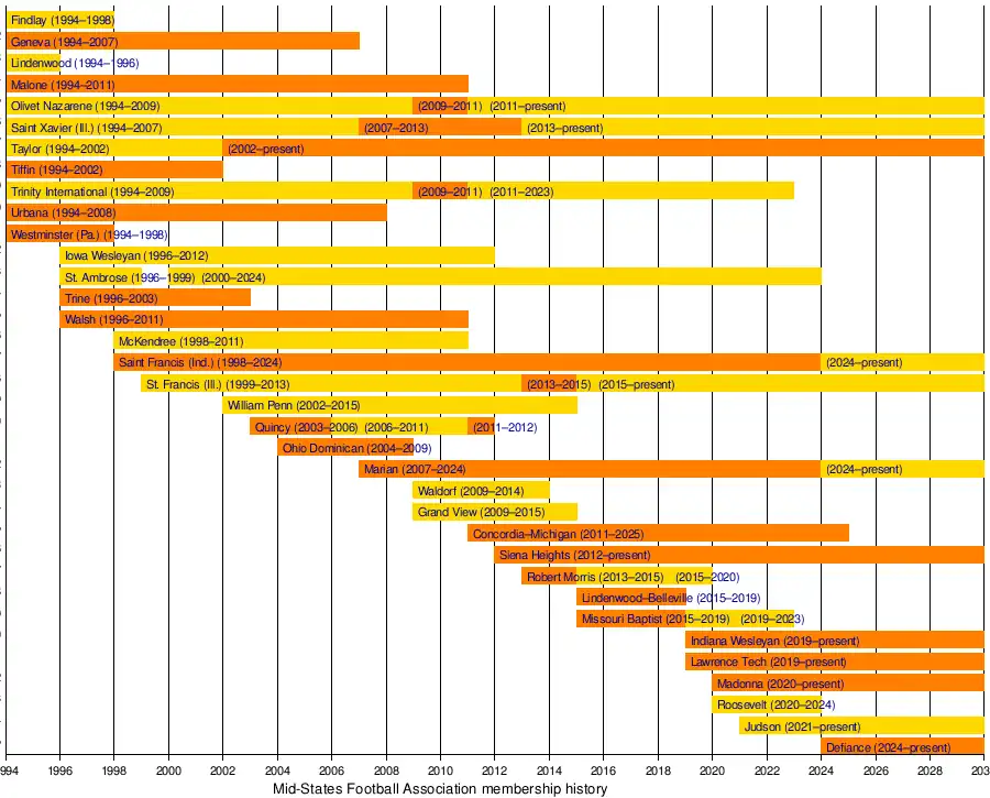 - 2026 – Siena Heights will leave the MSFA upon the closure of the university after the 2025–26 academic year.