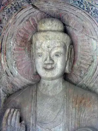 The back wall is a carved Sakyamuni, with two disciples and two bodhisattvas. The main Buddha and bodhisattvas are representative of the Northern Wei sculptural style. A lotus-flower pool decorates the floor. The ceiling is engraved with a blossoming lotus flower, 8 musical apsarases, 2 attending apsarases and tassel and drapery patterns. The front wall is covered with a large Vimalakirti relief, the Prince Sattva jataka, the Prince Sudatta jataka, an emperor/empress worshipping scene and ten deity kings.