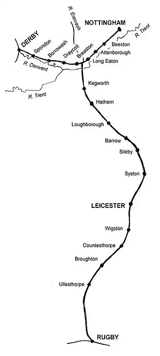 ![]() Map of the route of the Midland Counties' Railway | |