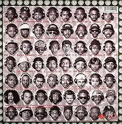 The album cover artwork depicts a woman painted in Afrocentric colors, continuing the artistic theme found on The Low End Theory.[25] According to Ego Trip's Book of Rap Lists, there are a reported 71 different hip hop luminaries and radio DJs who adorned Midnight Marauders.[29] Andrew Noz of Complex called it one of hip hop's "last grand displays of cultural unity as the Coastal fallout loomed imminent."[30] The book goes into detail as to which artists were on which particular album cover using a number scheme to easily identify each artist.[29] The complete list of artists is as follows: 3rd Bass, Afrika Bambaataa, AMG, Ant Banks, Beastie Boys, Awesome Two, Black Moon, Busta Rhymes, Casual, Chi-Ali, Chubb Rock, Chuck D, The Cold Crush Brothers, Daddy-O of Stetsasonic, Dallas Austin, Del the Funky Homosapien, Diamond D, De La Soul, Doctor Dré, Doug E. Fresh, Fab Five Freddy, Grandmaster Dee of Whodini, Grandmaster Flash, Heavy D, Ice-T, Jazzy Jay, DJ Jazzy Joyce, Jungle Brothers, Kid Capri, Kool DJ Red Alert, Kool Moe Dee, Large Professor, Litro, Lords of the Underground, MC Lyte, Neek the Exotic, Organized Konfusion, The Pharcyde, Rashad Smith, Rock Steady Crew (Crazy Legs, Mr. Wiggles, Pee Wee Dance and Ruel), DJ Ron G, DJ Silver D, Sean Combs, Skeff Anselm, Souls of Mischief, Special Ed, Sweet Tee, Too Short and Zulu Nation Supreme Council.[29]