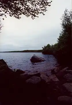 The Midstate Trail corridor includes woodland, lake shores, ledges, swamp borders, small mountains, agricultural land, meadows, brooks, as well as a few classic New England hamlet commons. Suburban areas abut the trail in places. The highest point on the Midstate Trail is the 2006-foot (611m) summit of Mount Wachusett from which the Boston skyline, 45 miles (72 km) away, is visible in clear weather. The cliffs of Mount Watatic and the Crow Hills are considered particularly scenic. The damp woodlands throughout the trail corridor are scattered with stone walls, a reminder that the forest was farmland in the 19th century. Common on the trail are huge boulders, several of them balanced in unlikely positions, called glacial erratics; two noteworthy examples are Balance Rock on Mount Wachusett and Samson's Pebble in Oakham, Massachusetts.[1][3]