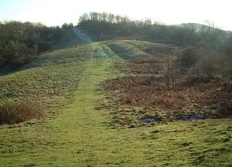 Midsummer Hill is situated in the range of Malvern Hills that runs approximately 13 kilometres (8 mi) north-south along the Herefordshire-Worcestershire border. It lies to the south of Herefordshire Beacon with views to Eastnor Castle.[1] It has an elevation of 284 metres (932 ft). To the north is Swinyard Hill. It is the site of an Iron Age hill fort which spans Midsummer Hill and Hollybush Hill. The hillfort is protected as a Scheduled Ancient Monument and is owned by Natural England. It can be accessed via a footpath which leads south from the car park at British Camp on the A449 or a footpath which heads north from the car park in Hollybush on the A438.[2]
