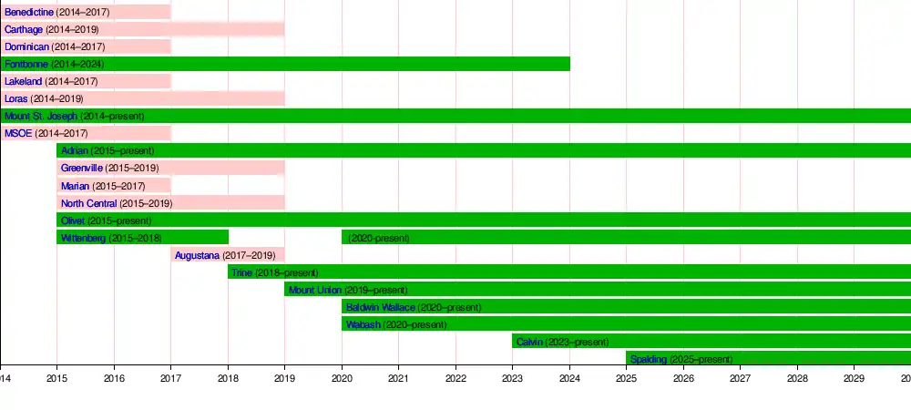 In September 2014, two Illinois schools that were adding volleyball in the 2015–16 school year (2016 season), Greenville College (now Greenville University) and North Central College, were accepted as the league's 9th and 10th members.[4] Three months later, four additional schools—Adrian College, Marian University of Wisconsin, Olivet College, and Wittenberg University—were announced as new members for 2015–16.[5]