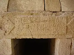 From a Byzantine-period church, a lintel set over a stone-built doorway survives, bearing the Greek inscription "ΜΑΡΤΥΡΙΟΝ ΤΟΥ ΑΓΙΟΥ ΚΗΡΥΚΟΥ", Martyr shrine (martyrion) of Saint Kyriko.[3][4] The room behind it was used by the al-Rayyan sheikh as a stable and for fodder storage.[4]