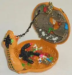 More variations were planned for the previously released Doom Zones and Horror Heads, and even Shrunken Heads. Colour variations for three Series 1 Doom Zones - Skull Dungeon, Doom Dragon and Temple of Venom - were shown in a Mattel Toy Catalog but never actually released.[8] More interestingly, there were a number of metallized sets planned, a first for the series - development images show metallized versions of the Skull Dungeon and Temple of Venom Doom Zones, the Vamp Biter, Lockjaw and Kronosaur Horror Heads, and the Mummy, Insectoid and Rat Trap Shrunken Heads.[9]